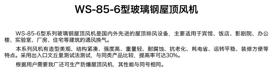 WS-85-6型系列玻璃鋼屋頂風(fēng)機(jī)是國內(nèi)外先進(jìn)的屋頂排風(fēng)設(shè)備,主要適用于賓館、飯店、影劇院、辦公 樓、實(shí)驗(yàn)室、廠房、住宅等建筑的通風(fēng)換氣。